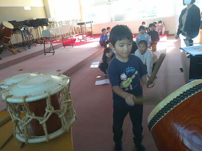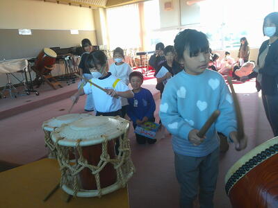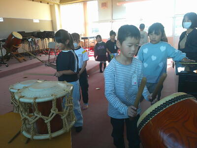 1,2年生は、湯津上中ブラスバンドの演奏を目を丸くして聴いています。