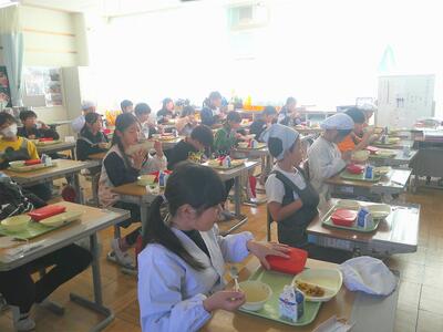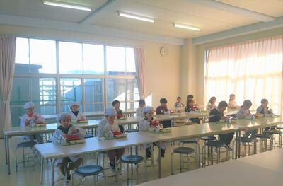 1,2年生は、ランチルームで人と人との間隔をあけて前向き給食を実施しています。
