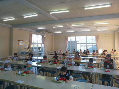 通常は、みんなそろってランチルームで給食をいただくのですが、感染症予防として前向き給食を実施中です。一日も早く、また、みんなそろっての給食を実施できますように。