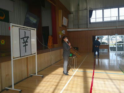 業間の時間は、全校生が一堂に会し、冬休み前集会を行いました。今年の漢字は「熊」と発表されましたが、子供たち一人一人、先生方の今年の漢字は何かな?6年生の今年の漢字は・・・