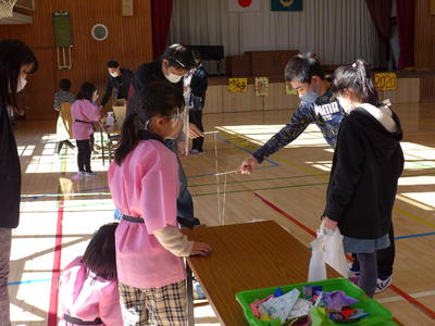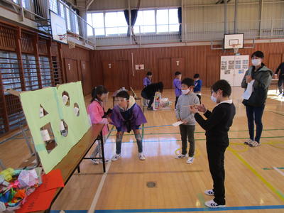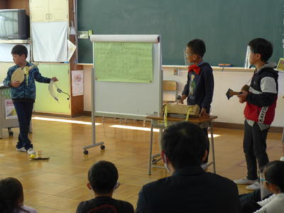 生活科の「動くおもちゃを作ろう」の学習を生かして、おまつりの屋台風に発表しました。