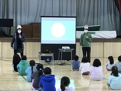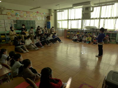 生活科の「みんなとなかよくなりたいな」の学習を生かして「友達紹介」と「先生クイズ」を、国語科からは「くじらぐも」を音読劇にして発表しました。