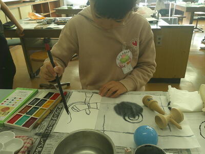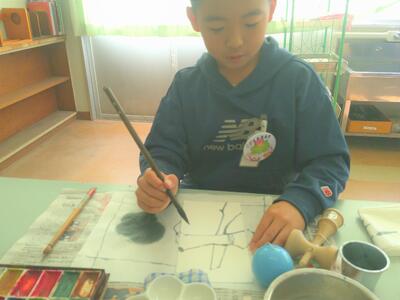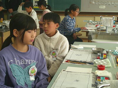 続けて5年生の絵手紙制作です。昨年度の福祉の学びと絵手紙の学びを生かして落ち着いて取り組む5年生です。胸には「こども民生委員」の缶バッチをつけています。
