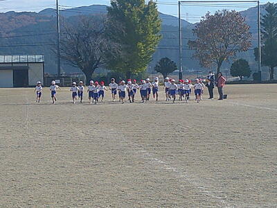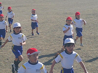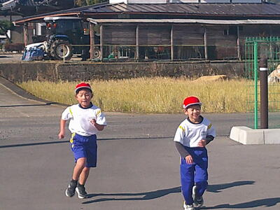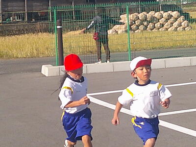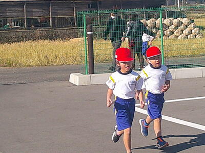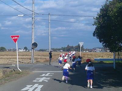 青空の下、1、2年生が持久走大会に向けて試走を行いました。
