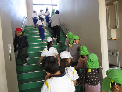 そして、年長児さんと1年生がグループを組み、校内探検を開始。年長児の皆さんは、見るもの聴くものすべてが新鮮なのでしょう、目をキョロキョロさせています。1年生は、先輩となり自信をもって紹介しています。