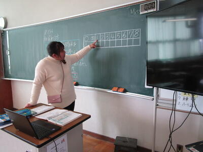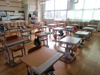 6年生の教室にある机といすが高いし、大きなお兄さん、お姉さんにびっくりしています。